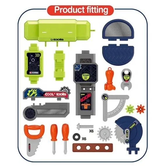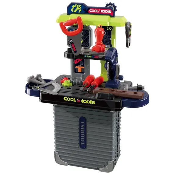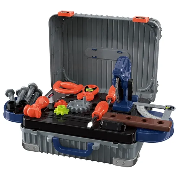 Setul de unelte pentru copii nu este doar o jucărie, ci un adevărat constructor pentru micii meșteșugari. Cazul compact se transformă ușor într-un banc de lucru, iar dacă îl desfaci, obții o masă convenabilă cu rafturi pentru piese. În interior se află un arsenal pentru creativitate: fierăstrău pentru tăierea lemnului imaginar, set de șurubelnițe pentru asamblarea mecanismelor, cheie pentru fixarea șuruburilor și piulițelor, roți dințate, șuruburi și alte unelte. Geanta se închide cu cleme sigure, poate fi pusă în rucsac și nu ocupă mult spațiu în cameră.