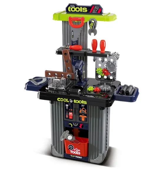 Setul de unelte pentru copii nu este doar o jucărie, ci un adevărat constructor pentru micii meșteșugari. Cazul compact se transformă ușor într-un banc de lucru, iar dacă îl desfaci, obții o masă convenabilă cu rafturi pentru piese. În interior se află un arsenal pentru creativitate: fierăstrău pentru tăierea lemnului imaginar, set de șurubelnițe pentru asamblarea mecanismelor, cheie pentru fixarea șuruburilor și piulițelor, roți dințate, șuruburi și alte unelte. Geanta se închide cu cleme sigure, poate fi pusă în rucsac și nu ocupă mult spațiu în cameră.