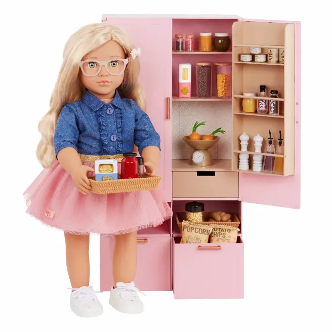 Dimensiuni: aproximativ 46 cm (înălțime) x 23 cm (lungime) x 11,5 cm (lățime). Ușile cămării se închid cu clic pentru o asamblare rapidă și ușoară. Compatibil cu majoritatea păpușilor de 46 cm înălțime, mobilier pentru păpuși și seturi de jucării pentru bucătărie. Păpușile se vând separat.