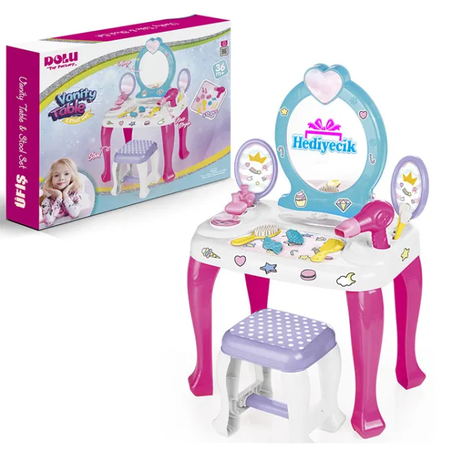 Setul Dolus magic de măsuță de toaletă cu scăunel este o măsuță de toaletă fermecătoare care cu siguranță va încânta fiecare mică prințesă. Setul este format dintr-o măsuță de toaletă și un taburet asortat care oferă un loc confortabil pentru a sta în timpul jocului. Măsuța de toaletă este dotată cu o oglindă, care îi permite micuțului dvs. să își vadă stilul, și cu rafturi pe care poate aranja o varietate de accesorii de machiaj și bijuterii.