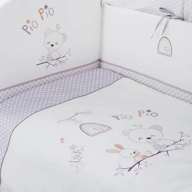 Am creat modelul Pio Pio pentru a avea grijă de bebelușul tău atât în timpul somnului, cât și în timpul zilei. Pentru a se asigura că somnul copiilor este calm și profund, setul este realizat din satin în nuanțe pastelate delicate. Un baldachin din voal și satin creează o atmosferă de confort și protejează bebelușul care doarme de excesul de lumină și praf. Iar când tânărul descoperitor se va trezi, va fi cu siguranță încântat de noii săi prieteni - personaje brodate manual.