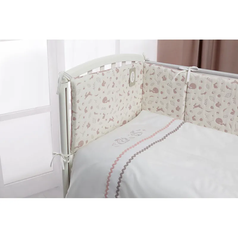 Setul elegant Perina Toys Pădure este potrivit pentru orice tip de interior, are nuanțe naturale și culori pastelate care oferă confort și rafinețe. Texturile diferite ale lenjeriei de pat și ale laturilor formează o combinație interesantă ce oferă libertate imaginației.