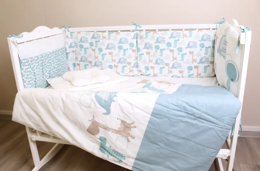 Cearșaf de pat: 120x60 cm (1 buc.), Cearșaf de plapumă: 120x90 cm (1 buc.), Față de pernă ortopedică: 30x25 cm (1 buc.), Față de pernă pentru copil: 50x30 cm (1 buc.), Plapumă: 120x90 cm (1 buc.), Pernă ortopedică: 30x25 cm (1 buc.), Pernă pentru copil: 50x30 cm (1 buc.), Aparatori: 120x38 cm (2 buc.), 60x38 cm (2 buc.)