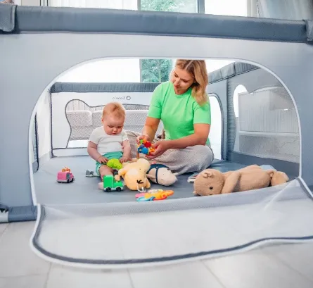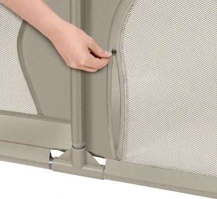 Tarc-ul dispune de două deschideri laterale cu fermoar, facilitând accesul copilului și permițându-i să intre și să iasă independent. Astfel, părinții nu trebuie să ridice copilul peste margini de fiecare dată, reducând efortul fizic. Materialele ușor de curățat mențin igiena spațiului de joacă. Datorită funcției de pliere rapidă și dimensiunilor compacte atunci când este pliat, tarc-ul poate fi ușor transportat și depozitat, inclusiv într-o geantă de transport inclusă, fiind perfect pentru călătorii sau organizarea spațiului de acasă.