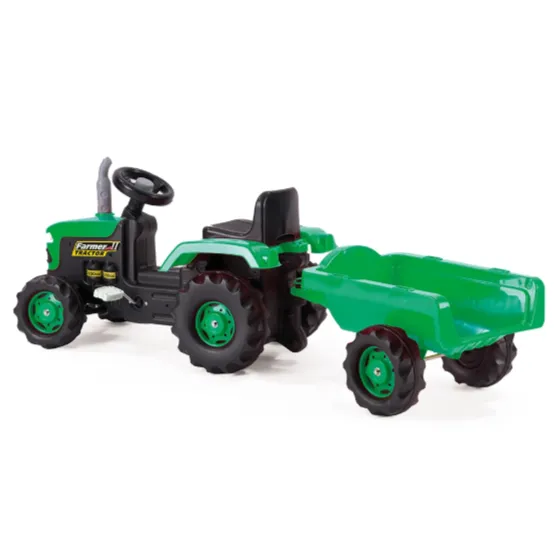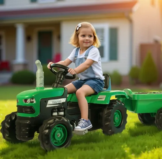 Tractorul cu pedale și remorcă este conceput pentru copiii care iubesc joaca în aer liber și activitățile dinamice. Sistemul de acționare cu pedale permite copilului să se deplaseze singur, dezvoltând coordonarea și forța musculară.