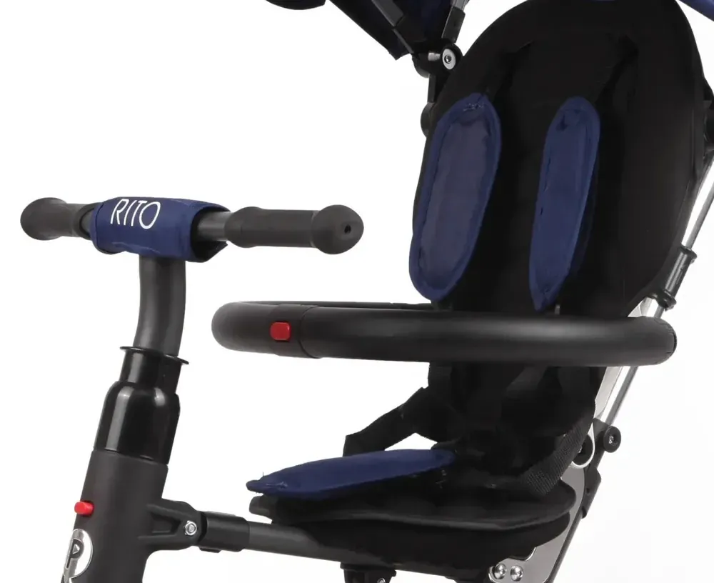 Viata moderna ne invata sa fim practici, iar parintii trebuie sa se adapteze cerintelor vietii urbane.Tricicleta QPlay Rito este solutia ideala pentru viata alaturi de bebe. Compacta si usor de utilizat, Rito ofera o experienta deosebita in timpul plimbarilor in parc sau prin oras.Tricicleta multifunctionala Rito poate fi folosita de la 12 luni la 3 ani. Design-ul deosebit ofera micutilor plimbari sigure si confortabile, iar sistemul de pliere compact o transforma in tricicleta ideala.Confortul copilului este asigurat de husa moale care imbraca sezutul si spatarul. Spatarul tricicletei se inclina pentru a-i oferi micutului o pozitie confortabila in timpul somnului. Siguranta copilului este oferita de centurile de siguranta in 5 puncte si de bara de protectie ce nu ii vor permite acestuia sa cada din tricicleta in timpul deplasarii.Cadrul este fabricat dintr-un metal usor pentru o manevrabilitate facila iar culoarea negru mat va scoate in evidenta designul modern al tricicletei.Copertina il va proteja de soare, vant sau praf. Este dotata cu plasa in partea din spate pentru a permite aerisirea si supraveghere copilului.Tricicleta Rito este echipata cu roti din cauciuc plin (foarte utile pentru orice tip de teren, in special in cazul suprafetii de rulare denivelate), frana si aparatoare de noroi. Tija de directie ii permite parintelui sa dirijeze tricicleta cu o singura mana.