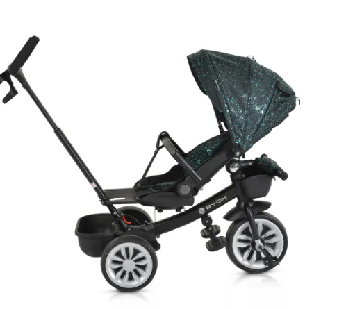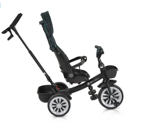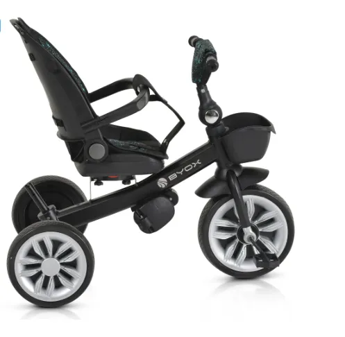 Scaunul tricicletei este echipat cu un scaun care poate să se rotească la 360 de grade și un spătar reglabil, care oferă confort și suport adecvat pentru copil. Mânerul reglabil permite părinților să direcționeze mișcarea roții din față pentru o gestionare mai ușoară.
