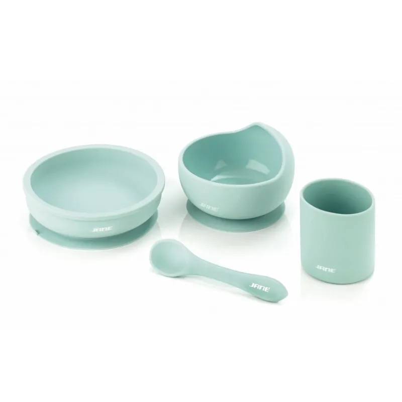 Setul de masă din silicon Jane pentru copii este confecționat din silicon și include un bol, o farfurie plată, o lingură și un pahar. Este practic și compatibil cu sterilizatoarele. Farfuria și bolul au ventuze la baza lor pentru o mai mare siguranță și comoditate. Bolul are un margini înalte pentru a ușura administrarea alimentelor lichide și semisolide.