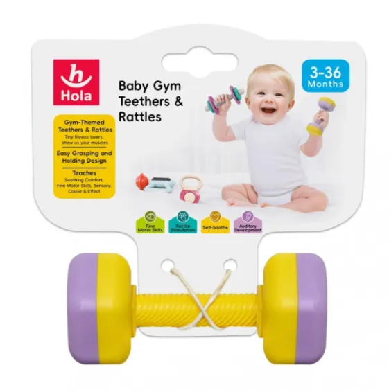 Zornăitoarea-ganteră din seria Baby Gym Teethers and Rattles de la HOLA este alegerea perfectă pentru dezvoltarea timpurie a bebelușului.