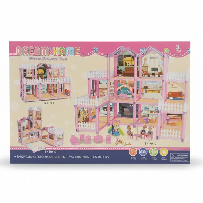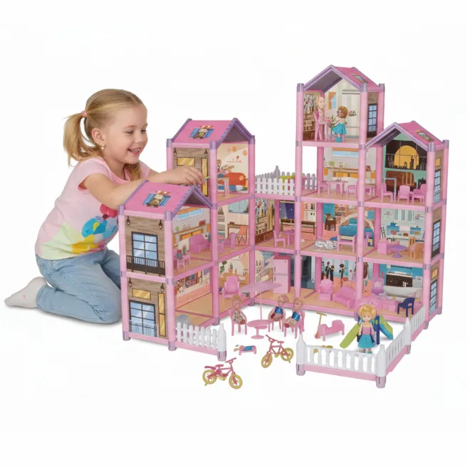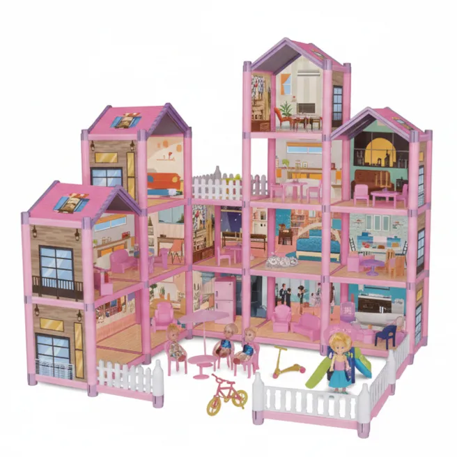 Этот великолепный многоэтажный дом для кукол — настоящая мечта для каждой маленькой принцессы! Он предлагает множество просторных комнат, балконов и даже уютный дворик, создавая идеальное пространство для бесконечных сюжетных игр.