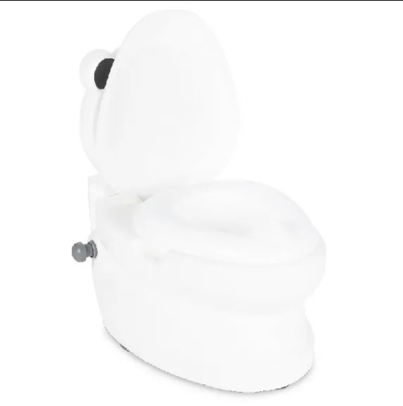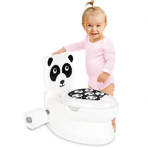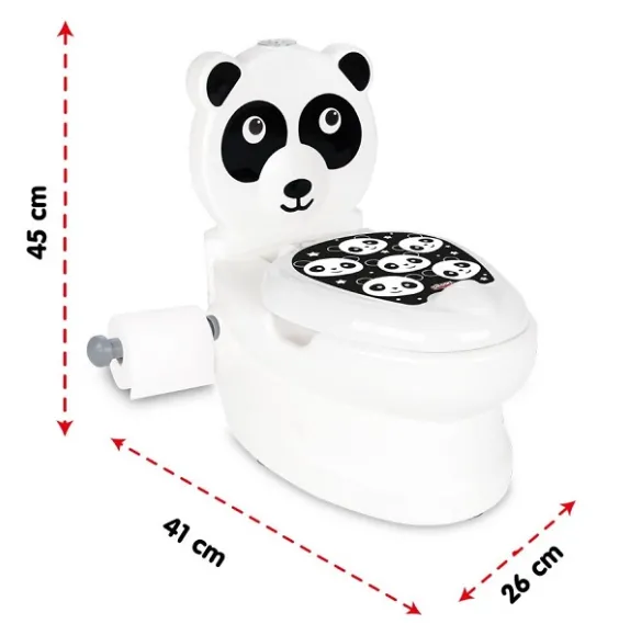 Горшок оборудован съёмной спинкой, которая имеет фигурную форму и яркую наклейку с изображением панды. Слив имитирует встроенная кнопка с эффектами, она воспроизводит реалистичный шум воды и подсвечивается разными цветами во время активации.