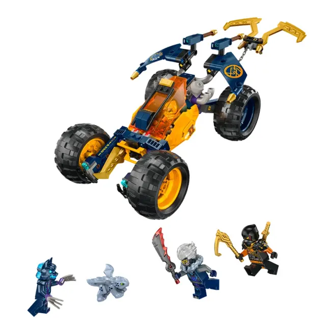Мальчики и девочки в возрасте от 7 лет и старше могут воссоздать захватывающие сцены из второго сезона телесериала NINJAGO: Восстание драконов с помощью багги ниндзя Арина LEGO NINJAGO. В этот детский приключенческий набор входит желтый игрушечный автомобиль с движущимися колесами, подвеской, открывающейся кабиной, в которой можно разместить 2 минифигурки, 2 шипомёта с 6 шипами для стрельбы и большой крюк сзади, чтобы ловить плохих парней.