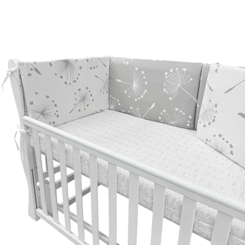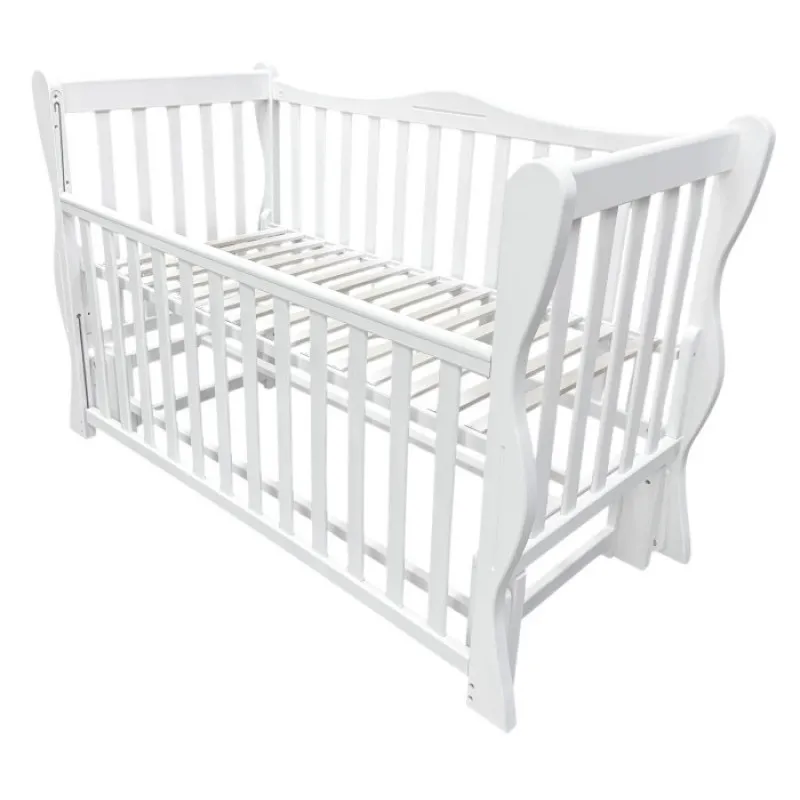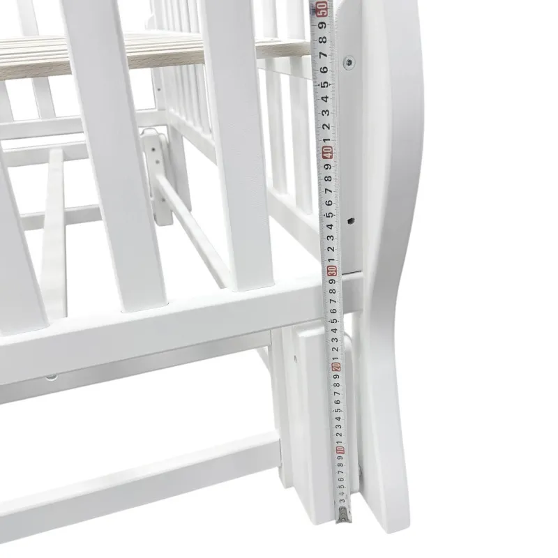 Кроватка имеет откидную боковину, бесшумный поперечный маятниковый механизм на подшипниках;