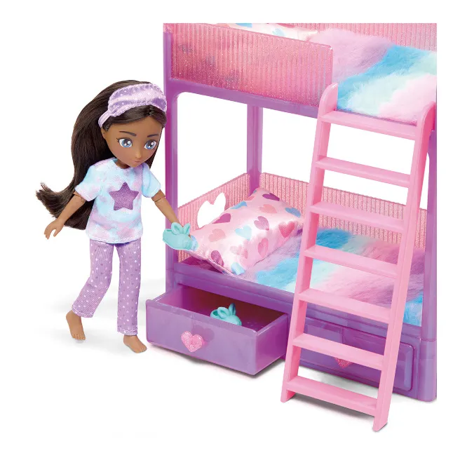 Обратите внимание на мелкие детали — по бокам каркаса кровати есть вырезы в форме сердечек, а также маленькие сердечки вместо ручек! Куклы высотой 5,5 дюйма также могут уютно устроиться с одеялами и подушками, входящими в этот набор. Устройте классную пижамную вечеринку, поговорите по душам и разыграйте самые невероятные сценарии между кукольными друзьями.