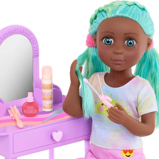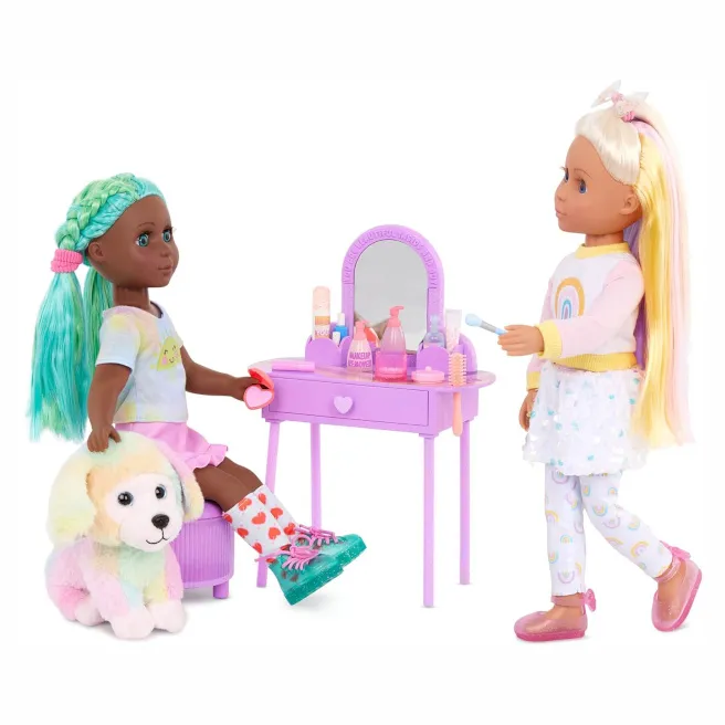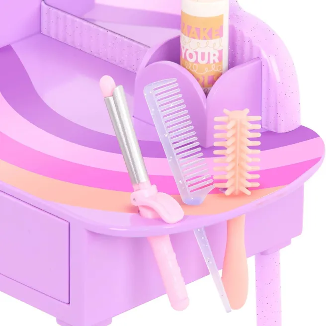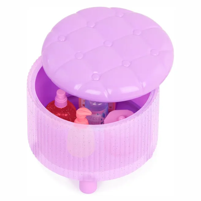 Игровой набор для макияжа Battat представляет собой очаровательный детский туалетный столик, как у настоящей модницы. Этот функциональный комплект включает в себя зеркало в декоративной раме, выдвижной ящик для хранения мелочей и мягкий пуфик для комфортной игры.