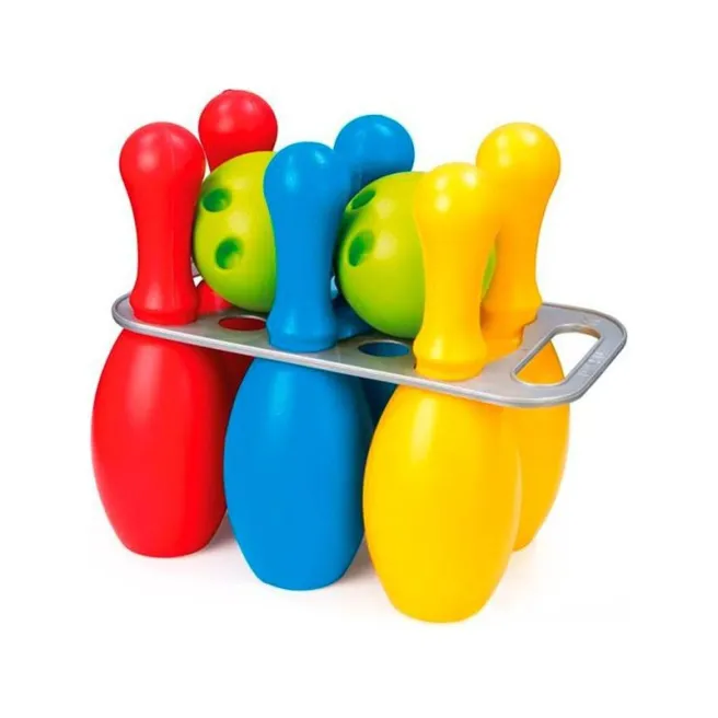 - Кегли выполнены в желтом, красном и синем цвете, зеленые мячи имеют на поверхности выемки для пальцев.