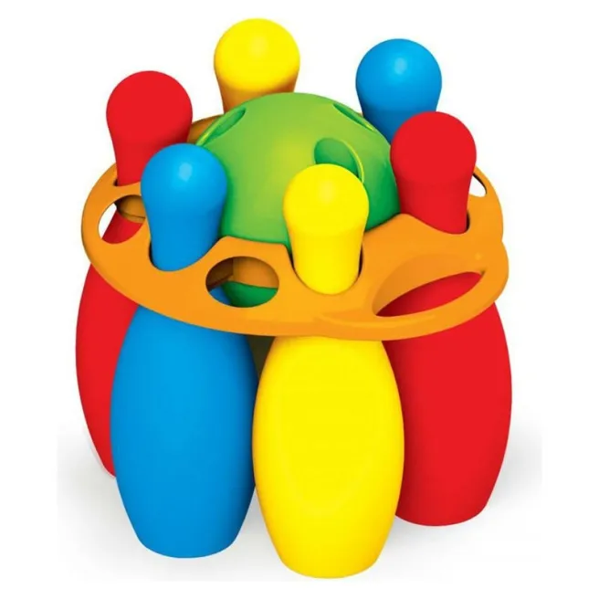 - Развивающая игрушка порадует малышей своим ярким дизайном – 6 кеглей и мяч имеют яркие цвета.