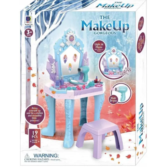 В набор входит всё необходимое для игры в салон красоты: столик с зеркалом, табурет и набор аксессуаров для макияжа.