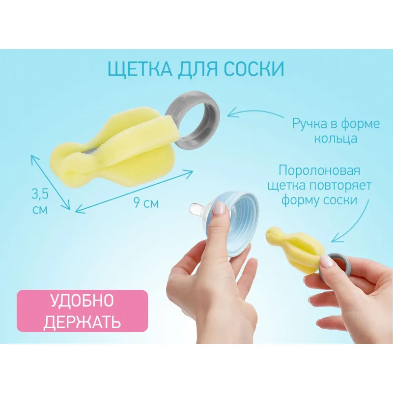 Маленькая щетка повторяет форму соски, а ручку в форме кольца удобно держать, надев на палец.