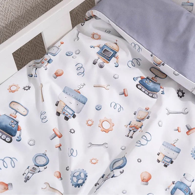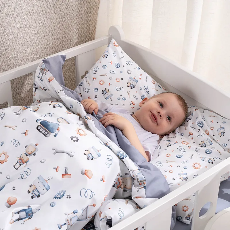 Новый дизайн, с которым можно не расставаться, даже когда растешь. Комплект Robo разработан в двух размерах: для кроватки новорожденного 120х60 см и спального места побольше, 160х80 см.