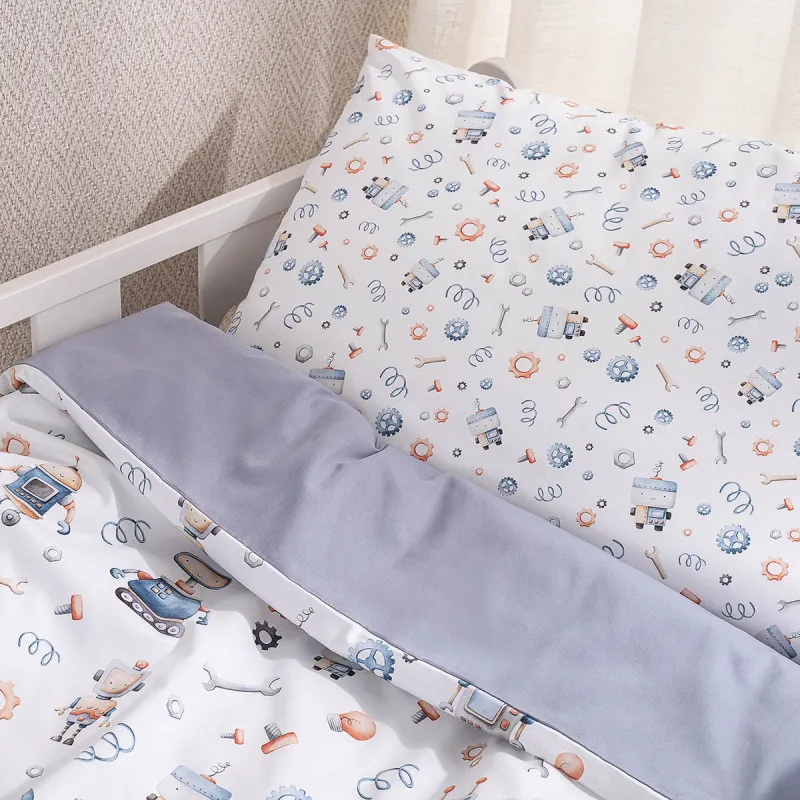 Дизайнерский принт с роботами украсит комнату, при этом не помешает малышу заснуть — цвета в узоре спокойные, натуральных оттенков. А милых акварельных роботов будет интересно рассматривать после пробуждения. Кстати, пододеяльник двусторонний и выгодно сочетается и с наволочкой, и с однотонной простыней.