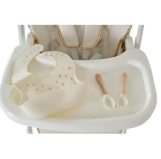 включает в себя высокий стульчик, силиконовый слюнявчик, ложку и вилку