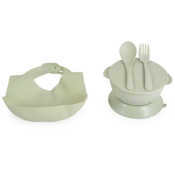 Силиконовый слюнявчик, миска с крышкой и противоскользящим дном, ложка и вилка — всё необходимое для первых самостоятельных приёмов пищи.