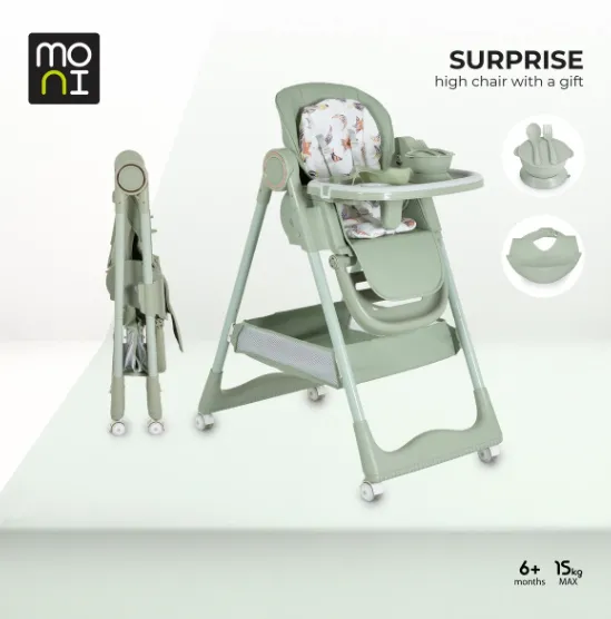 Создан с заботой о вашем малыше, стульчик Moni Surprise идеально подходит для первых самостоятельных трапез. Продуманный до мелочей, он сочетает комфорт, безопасность и регулируемость, а благодаря стильному дизайну и включённым аксессуарам станет незаменимым помощником на кухне.