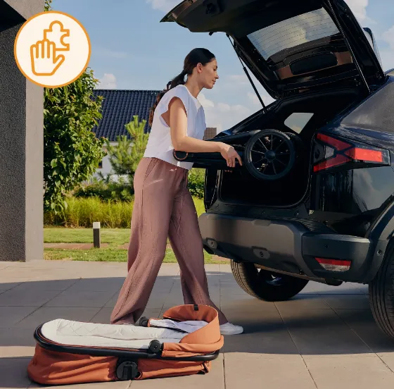Butoanele funcționale „memorează” setările anterioare, astfel încât căruciorul poate fi operat ușor cu o singură mână, pas cu pas. Această funcție simplifică îndepărtarea landoului, ajustarea scaunului sau plierea și desfacerea copertinei. Utilizarea căruciorului este astfel confortabilă și bine organizată, iar limitarea mișcărilor inutile reduce riscul de a trezi copilul.