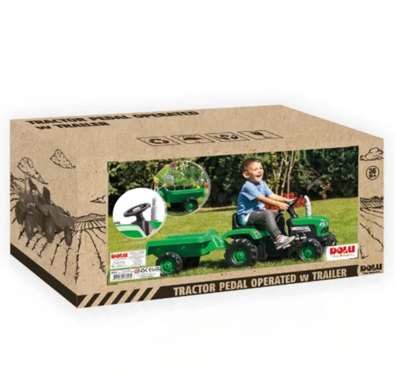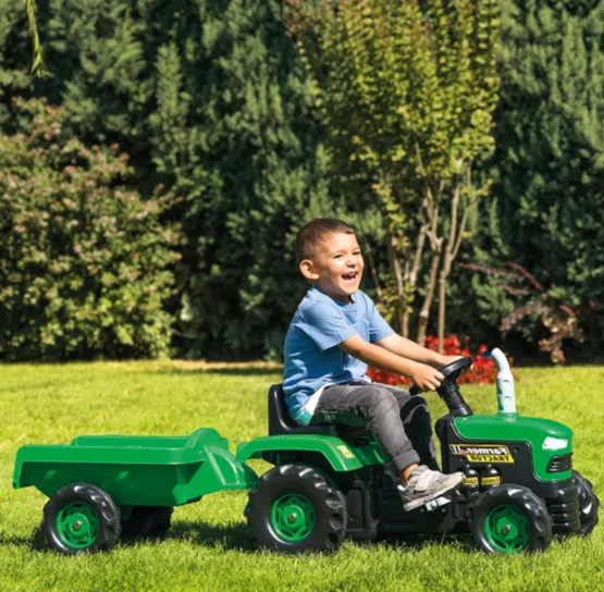 Tractorul cu pedale și remorcă este conceput pentru copiii care iubesc joaca în aer liber și activitățile dinamice. Sistemul de acționare cu pedale permite copilului să se deplaseze singur, dezvoltând coordonarea și forța musculară.
